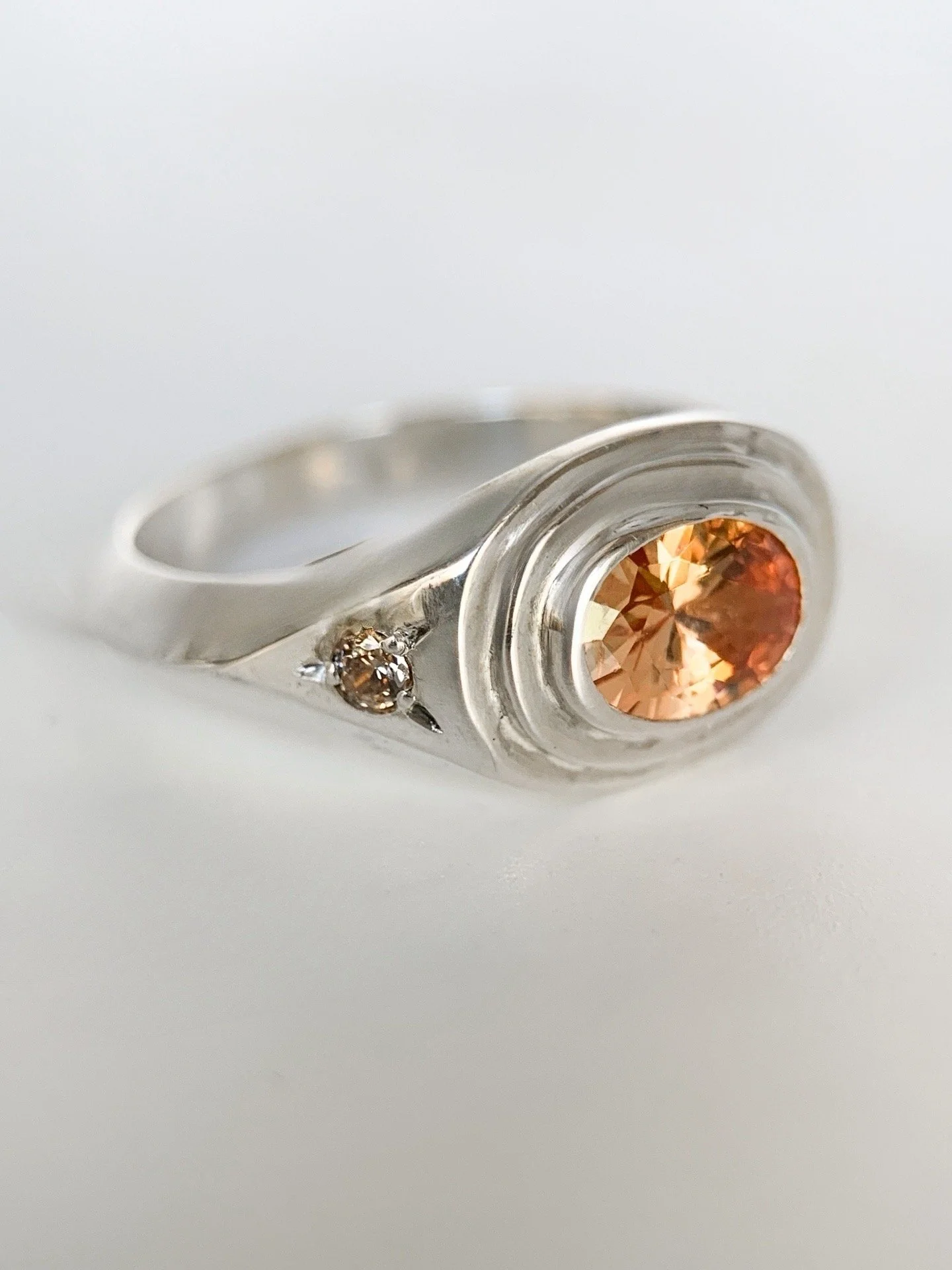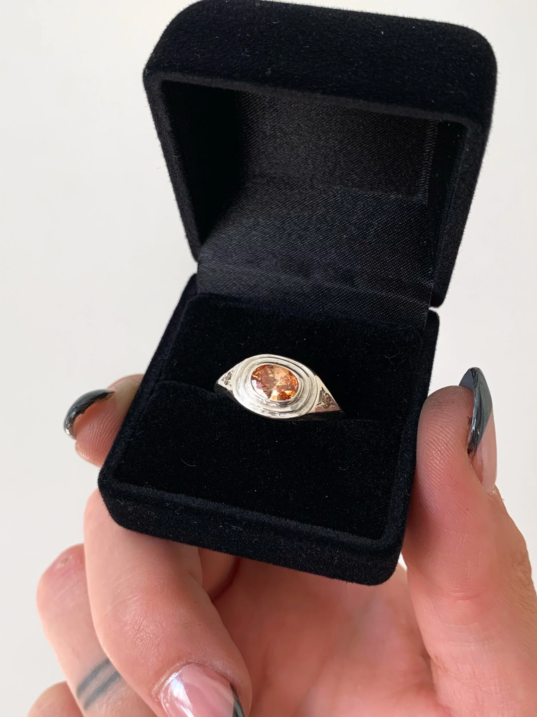 Handcrafted featuring a 7×5 champagne cubic zirconia with a stepped bezel setting with 2 2mm star set accent stones.