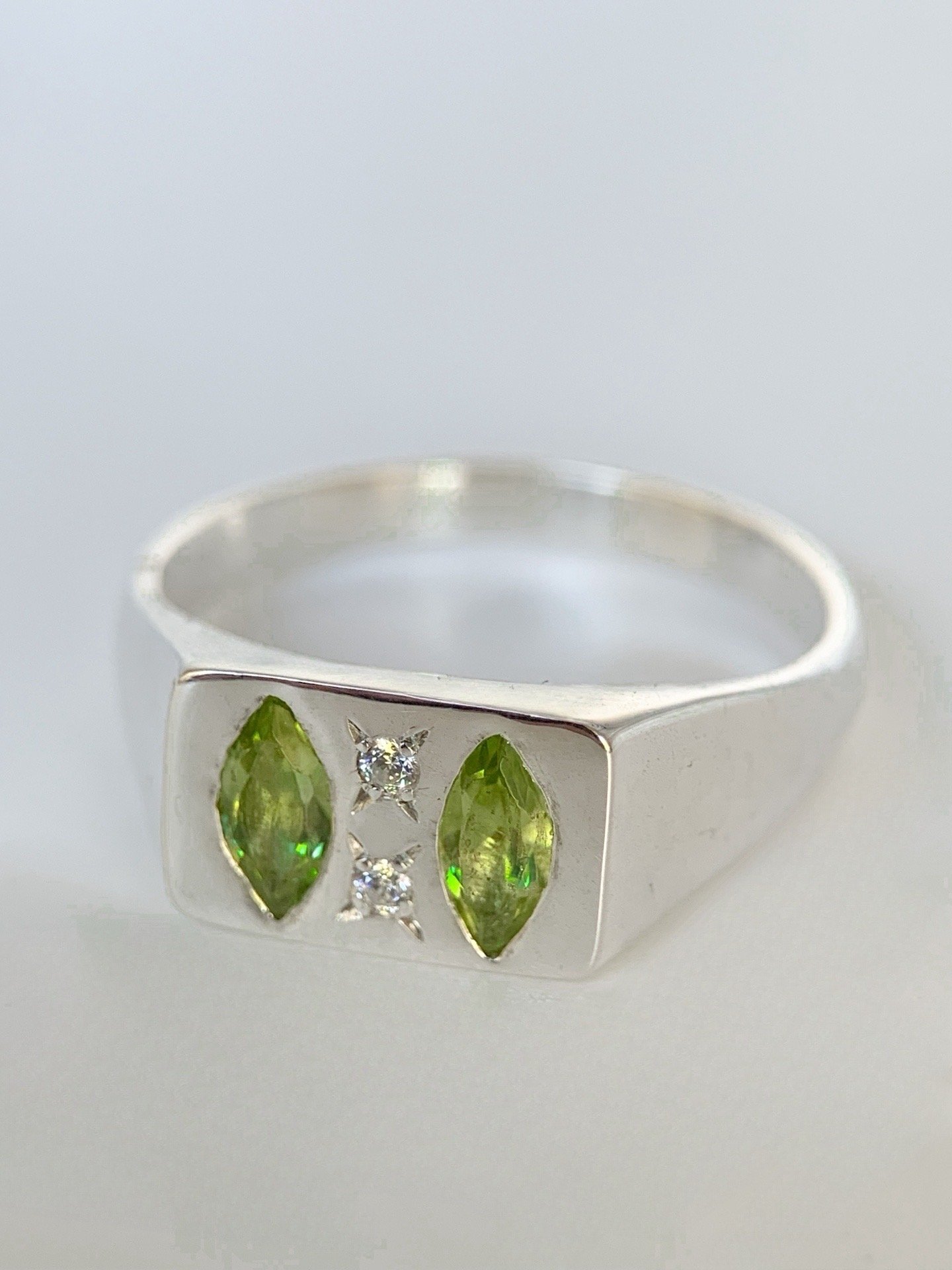 Handcrafted featuring two flush set 6×3 marquise peridot and two 1.5 star set cubic zirconia.