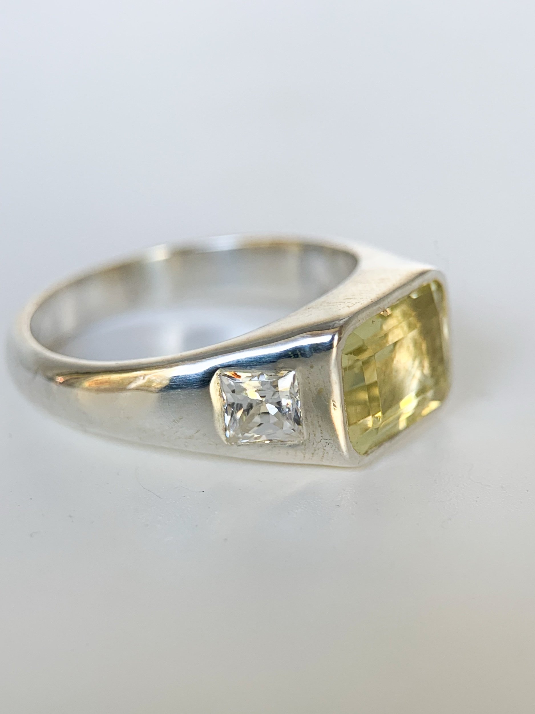 A bold one of a kind statement ring featuring a lemon quartz, set in sterling silver with subtle cubic zirconia accents on each shoulder.