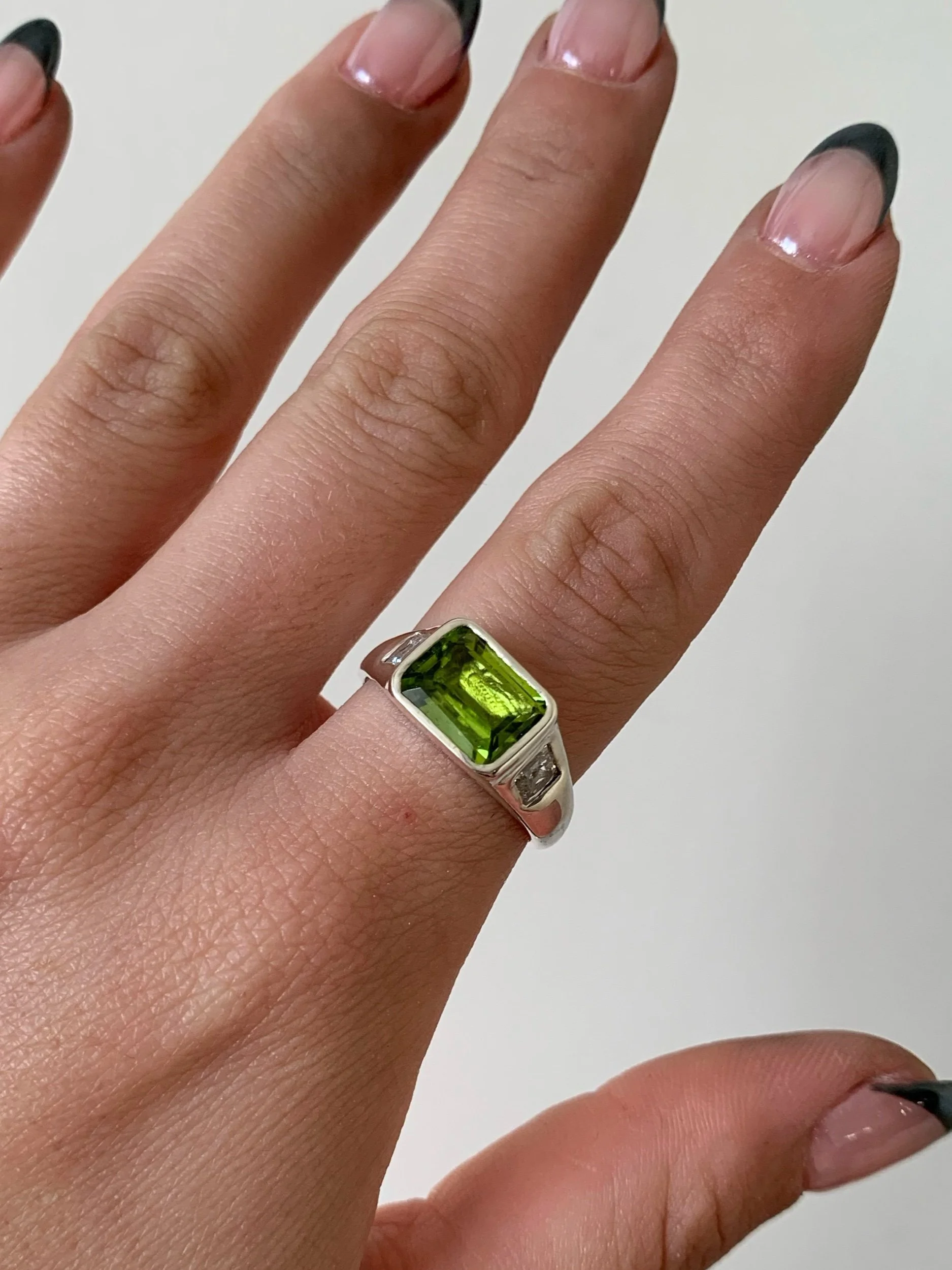 A bold one of a kind statement ring featuring a vibrant green peridot, set in sterling silver with subtle cubic zirconia accents on each shoulder.